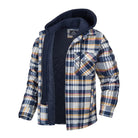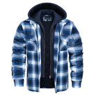 Voorkant blauw zwarte geruite jas met capuchon voor heren