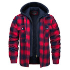 Voorkant zwart rode geruite jas met capuchon voor heren
