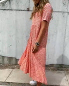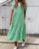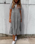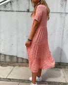 Korte mouwen en een midi-lengte maken deze jurk geschikt voor zowel casual als geklede gelegenheden.
