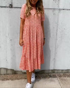 Deze charmante jurk met korte mouwen en subtiele bloemenprint is jouw go-to outfit voor zonnige dagen, gezellige uitjes of gewoon een fijne feel-good look. Hij zit heerlijk losjes en laat je er moeiteloos verzorgd uitzien – zonder gedoe.